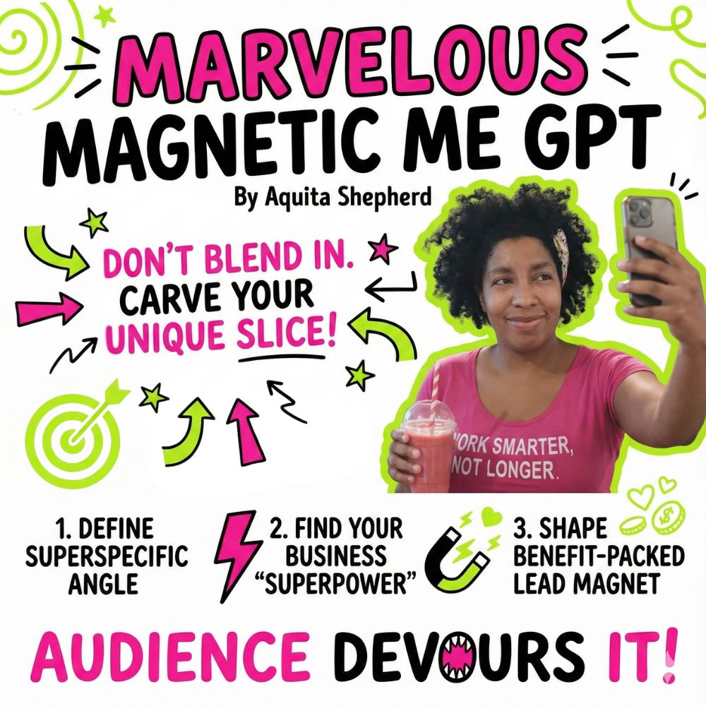 The Marvelous Magnetic Me GPT helps you discover what makes YOU different, nail your positioning, and create lead magnets people actually want. Get clarity without the guesswork...and no, stalking competitors for hours is NOT required.